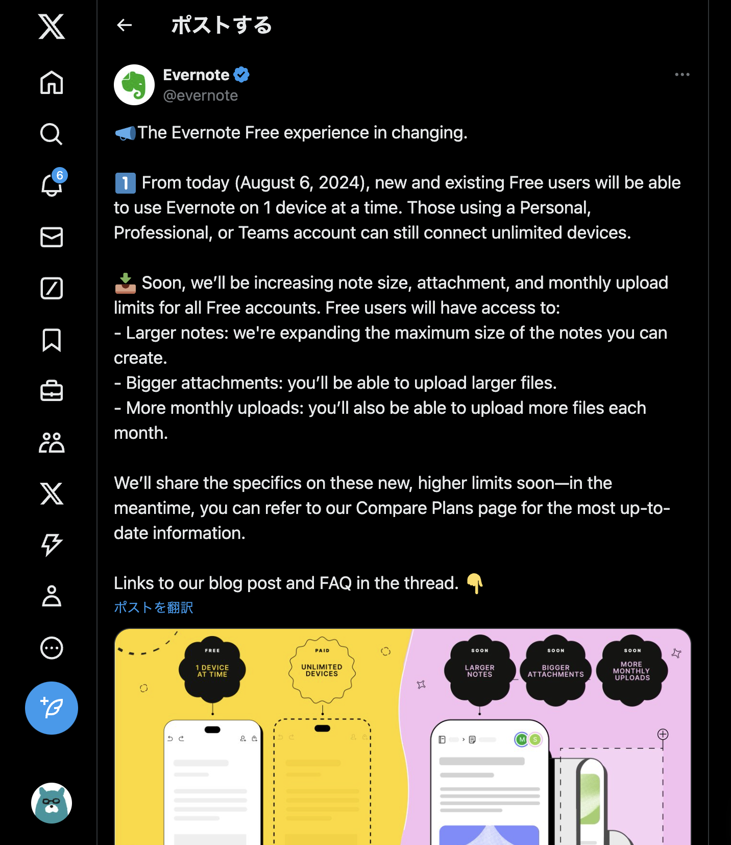 近日中に、全てのFreeアカウントのノートサイズ、添付ファイル、月間アップロード制限を拡大します。Freeユーザーは以下のアクセスが可能になります: