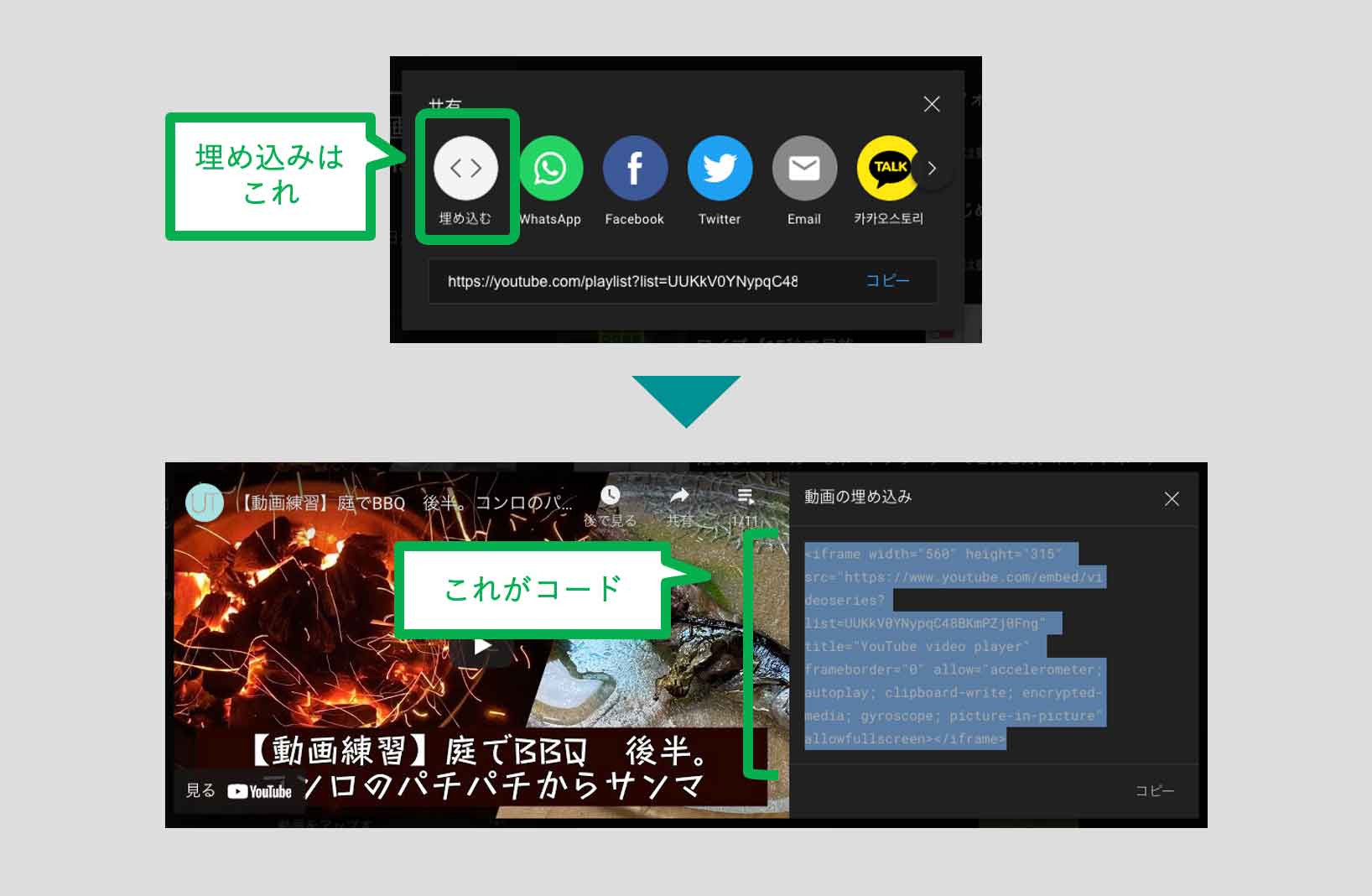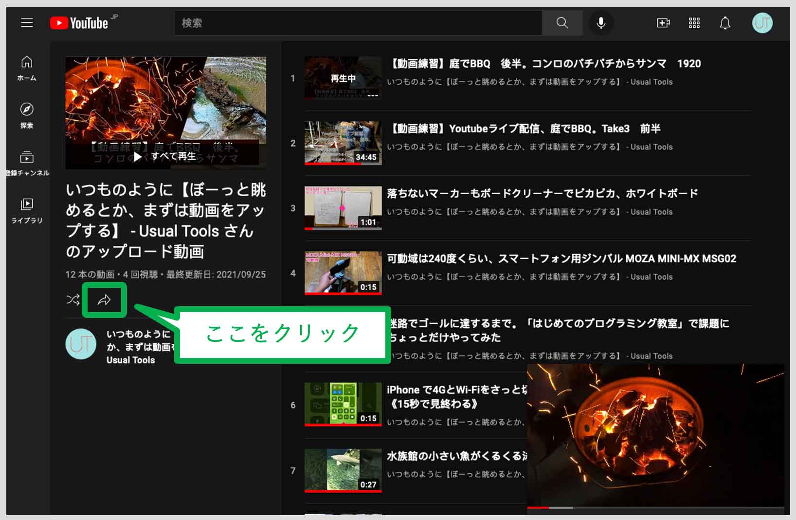 Youtubeの「アップロード動画」について、共有で埋め込みコードを取得するには