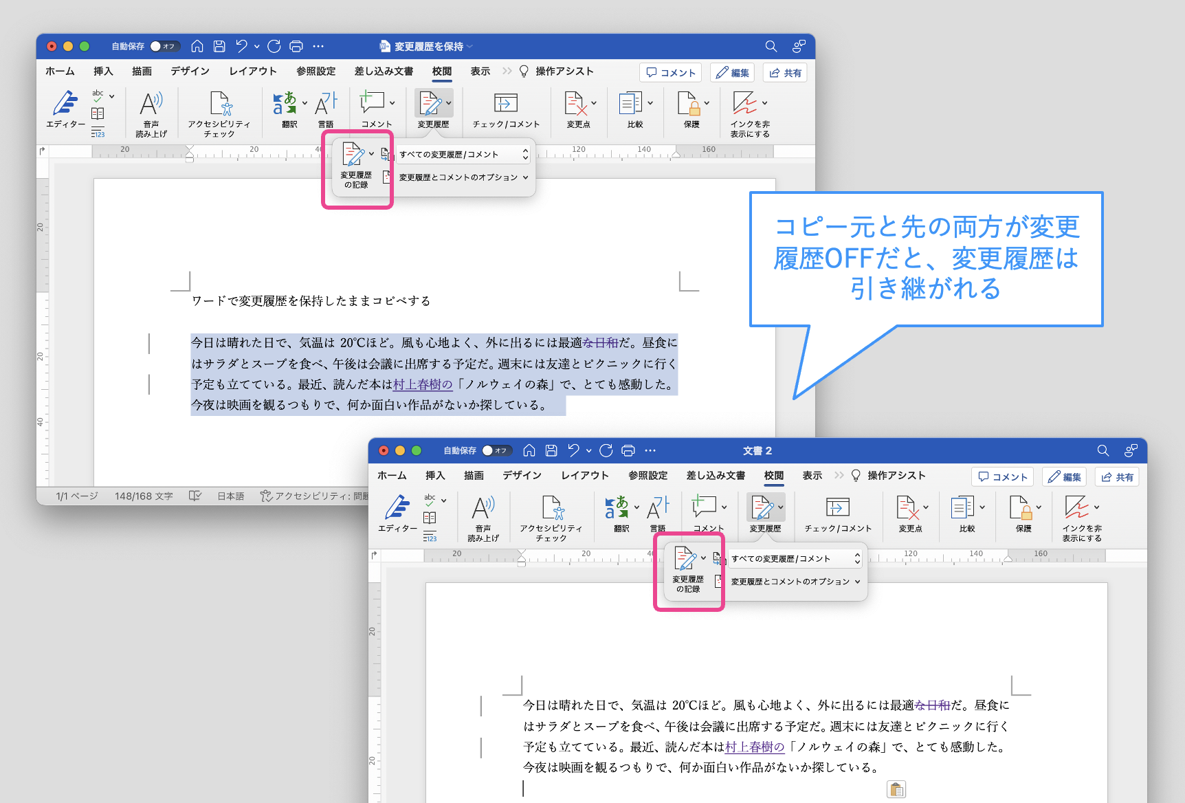 - ペースト先のワード文書でも「変更履歴の記録」をオフ